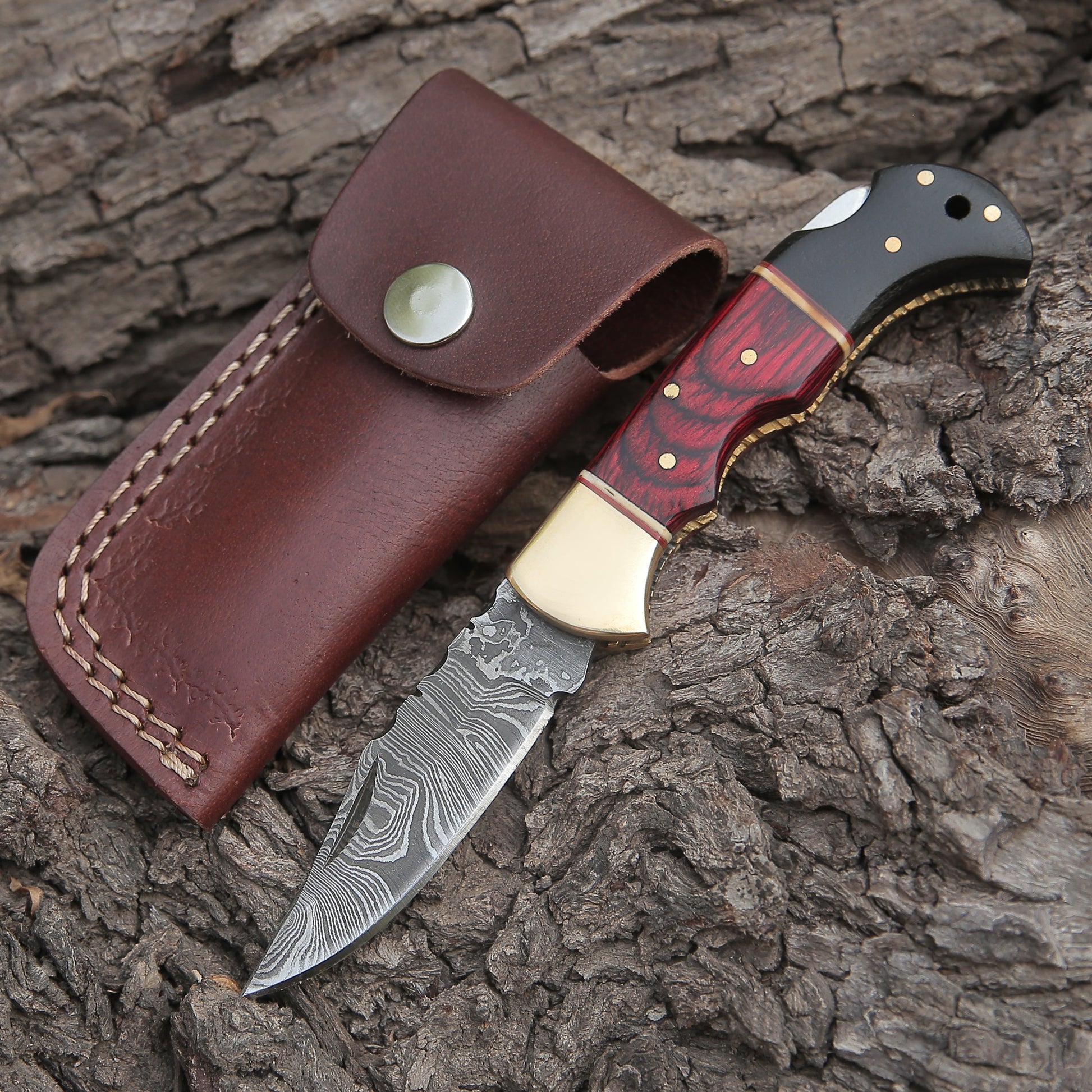 This Beautiful, Hand Forged Folding Knife Features High Grade Damascus Steel Blade & stainless steel frame work. The Red Dollar sheet & Black Horn Is Fixed With Brass Pins To a Brass Inlay. The Spine Of The Blade Has Been Embellished With Exquisite Vine Patterned File-Work.