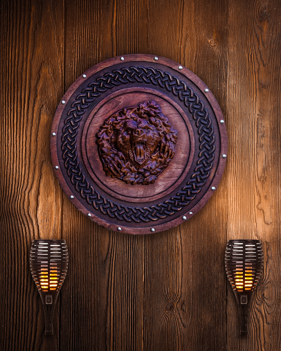 - Material - 15 mm thick wood for the base of the shield, 50 mm thick oak or beech wood for the bear head.