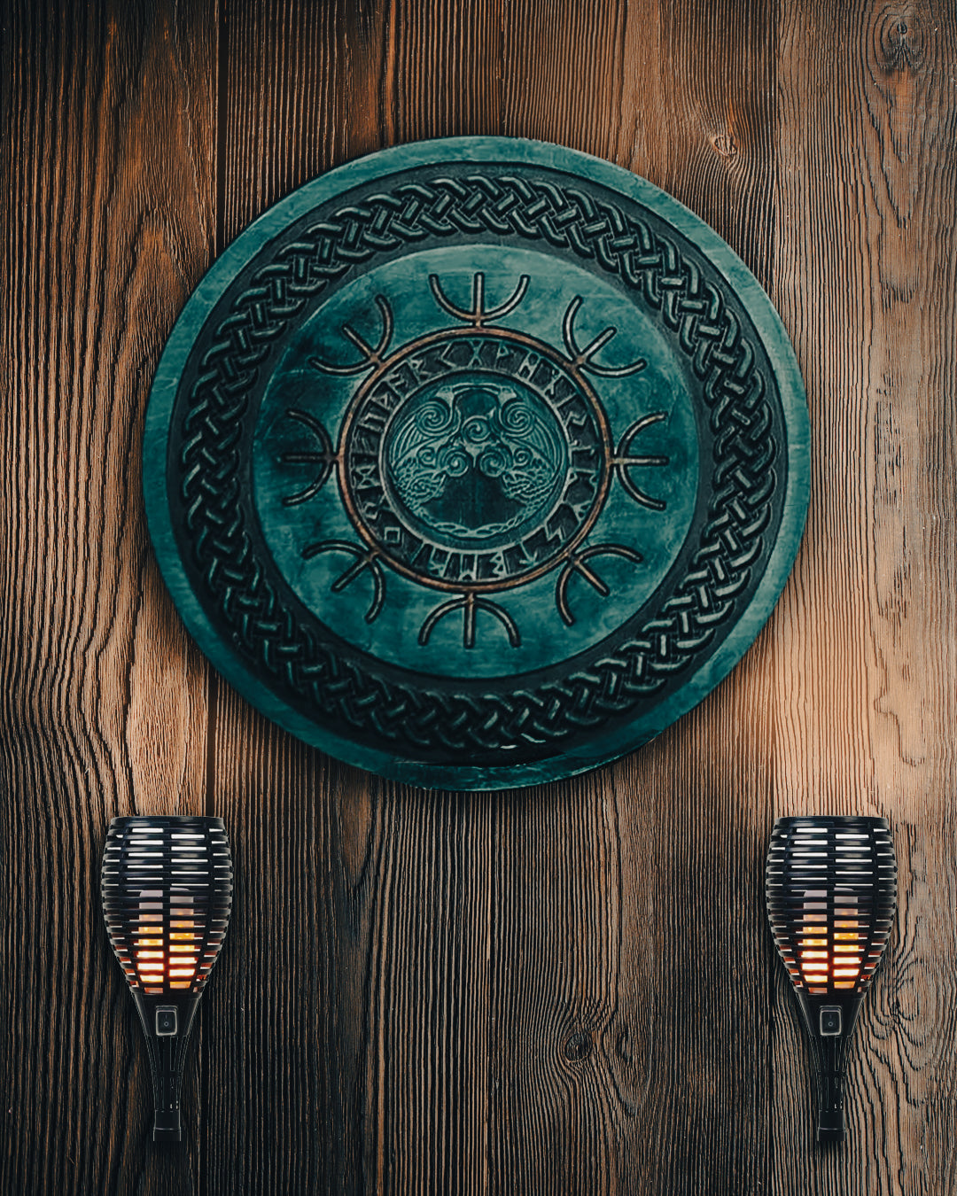 - The shield is made out of 15mm thick birch plywood, and finished with blue wood staining and varnishing acrylic-based coat. It can be used as a decorative wall hanger or as a functional piece for medieval reenactment or LARP.