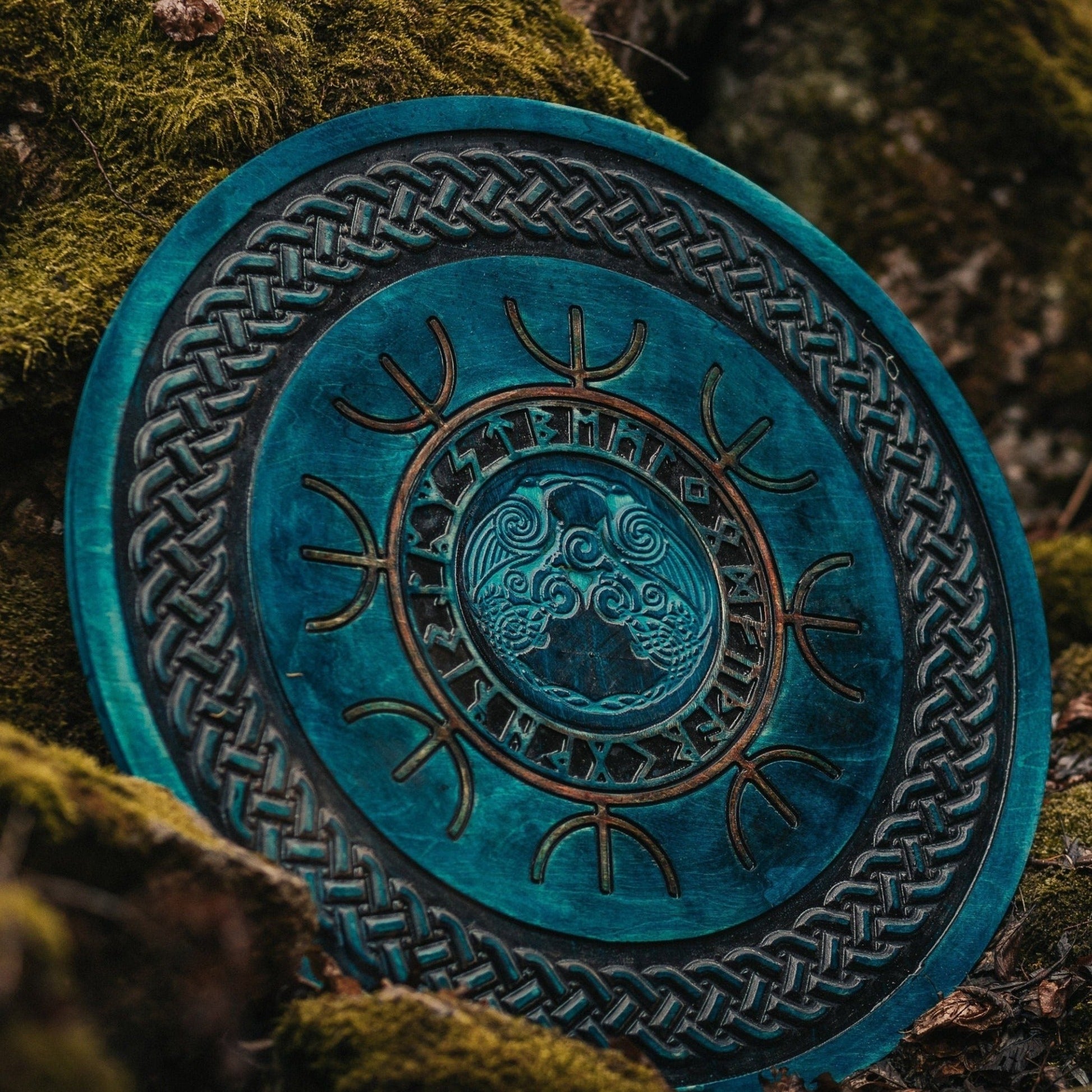 - This stunning blue wood shield features Odin's Raven symbols Huginn and Muninn, carved into the plywood, encircled by a circular braid, and a nordic stave. In Norse mythology, Odin's Ravens represent thoughts and memory. Viking warriors wore those symbols on their weapons to emulate in combat a sense of strategy and rational thinking that was critical for victory, raid after raid.